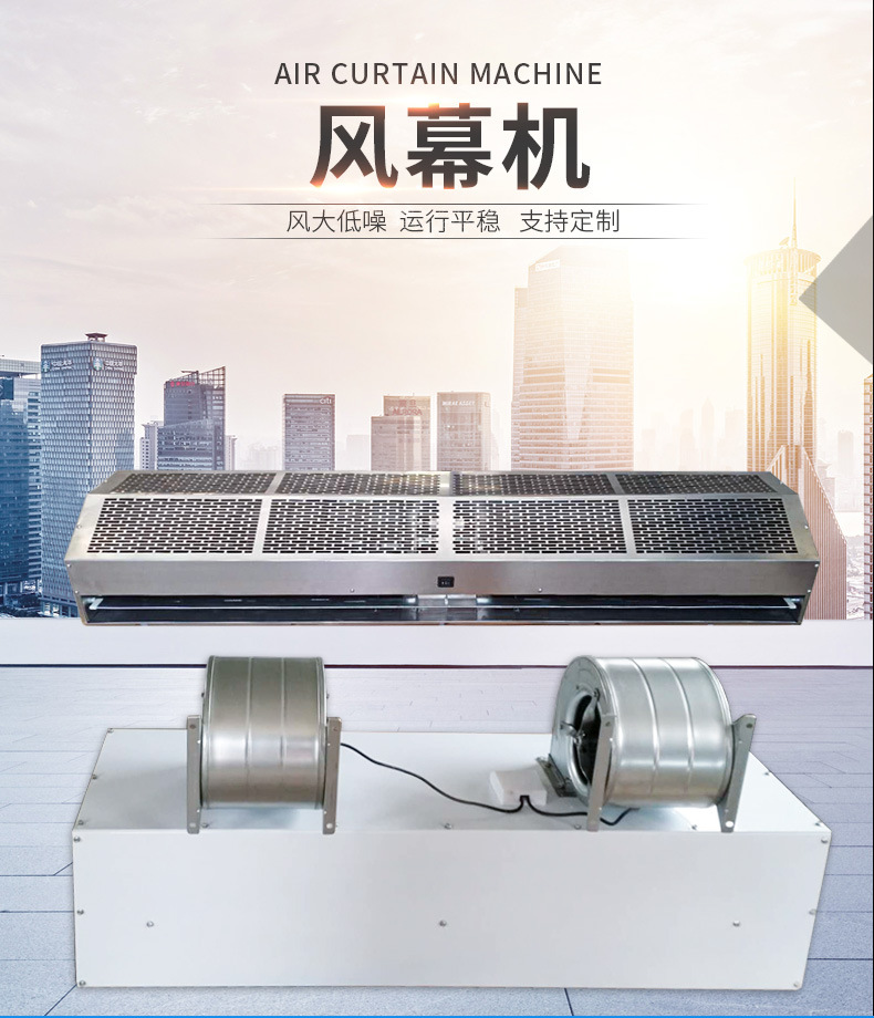 電加熱風幕機是通過高速電機帶動貫流或離心風輪產生的強大氣流,形成一面無形的門簾。因此,亦稱風簾機、空氣幕、空氣風幕機、風閘、空氣門。電加熱風幕機是風幕機中的一種.