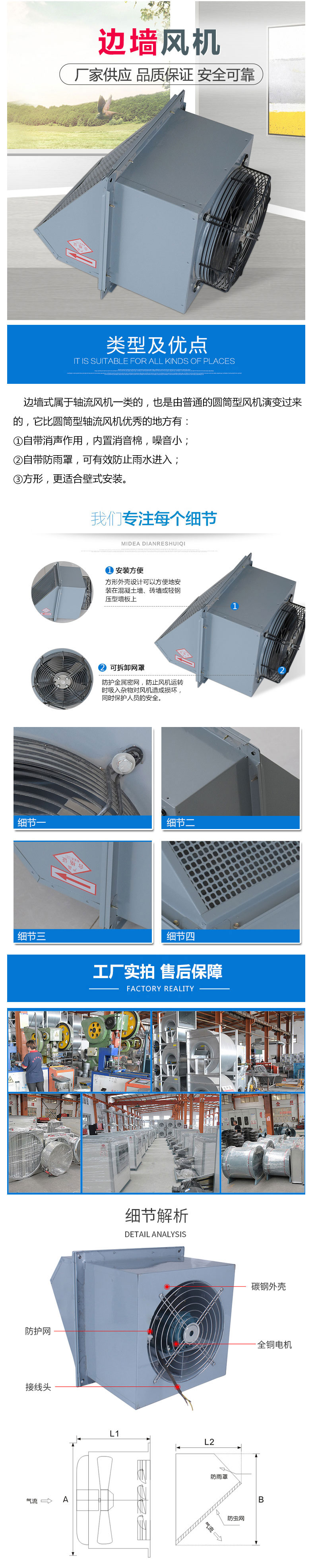 邊墻風(fēng)機(jī)采用的前掠型葉片、低噪音的外轉(zhuǎn)子或內(nèi)轉(zhuǎn)子風(fēng)機(jī)電機(jī)直聯(lián)傳動(dòng),方形外殼設(shè)計(jì)可以方便地安裝在混凝土墻、磚墻或輕鋼壓型墻板上,方形防雨罩結(jié) 構(gòu)牢固,外形美觀。具有噪聲低、風(fēng)量大、運(yùn)行可靠、性能參數(shù)范圍廣、安裝簡(jiǎn)便等特點(diǎn),廣泛應(yīng)用于廠礦企業(yè)車間和民用、商用建筑工程的邊墻壁式通風(fēng)換氣。根 據(jù)輸送介質(zhì)的要求,可制成防腐、防爆型。 WEX(DWEX)系列風(fēng)機(jī)一般用于邊墻壁式排風(fēng),配設(shè)45°防雨罩(或特殊制造成60°)和防蟲網(wǎng)(夜間可防止昆蟲循燈光飛入車間)。可按需要制成邊墻送風(fēng)機(jī)型號(hào)為DWSP(WSP),配設(shè)90°防雨罩(防風(fēng)、雨、塵)和防蟲網(wǎng)(夜間可防止昆蟲循燈光飛入車間)。