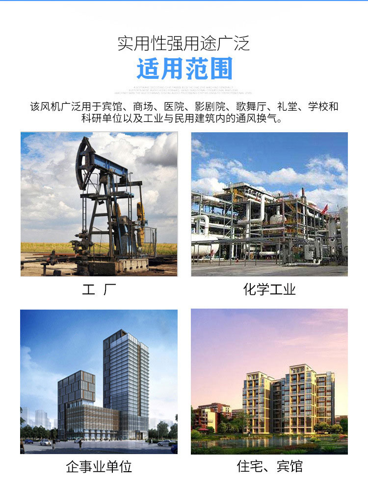 4-72離心風機作為一般工廠及大建筑物的室內通風換氣,即可用作輸入氣體,也可用作輸出氣體。空氣和其它不自燃、對人體無害的、對鋼鐵材料無腐蝕性的氣體。